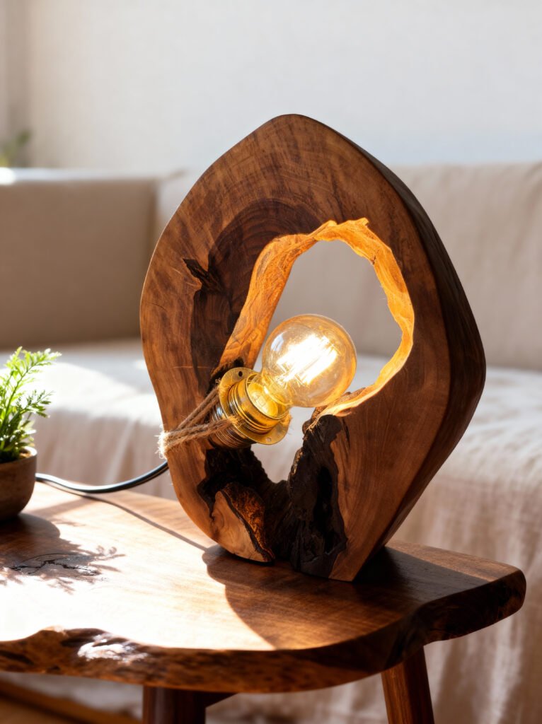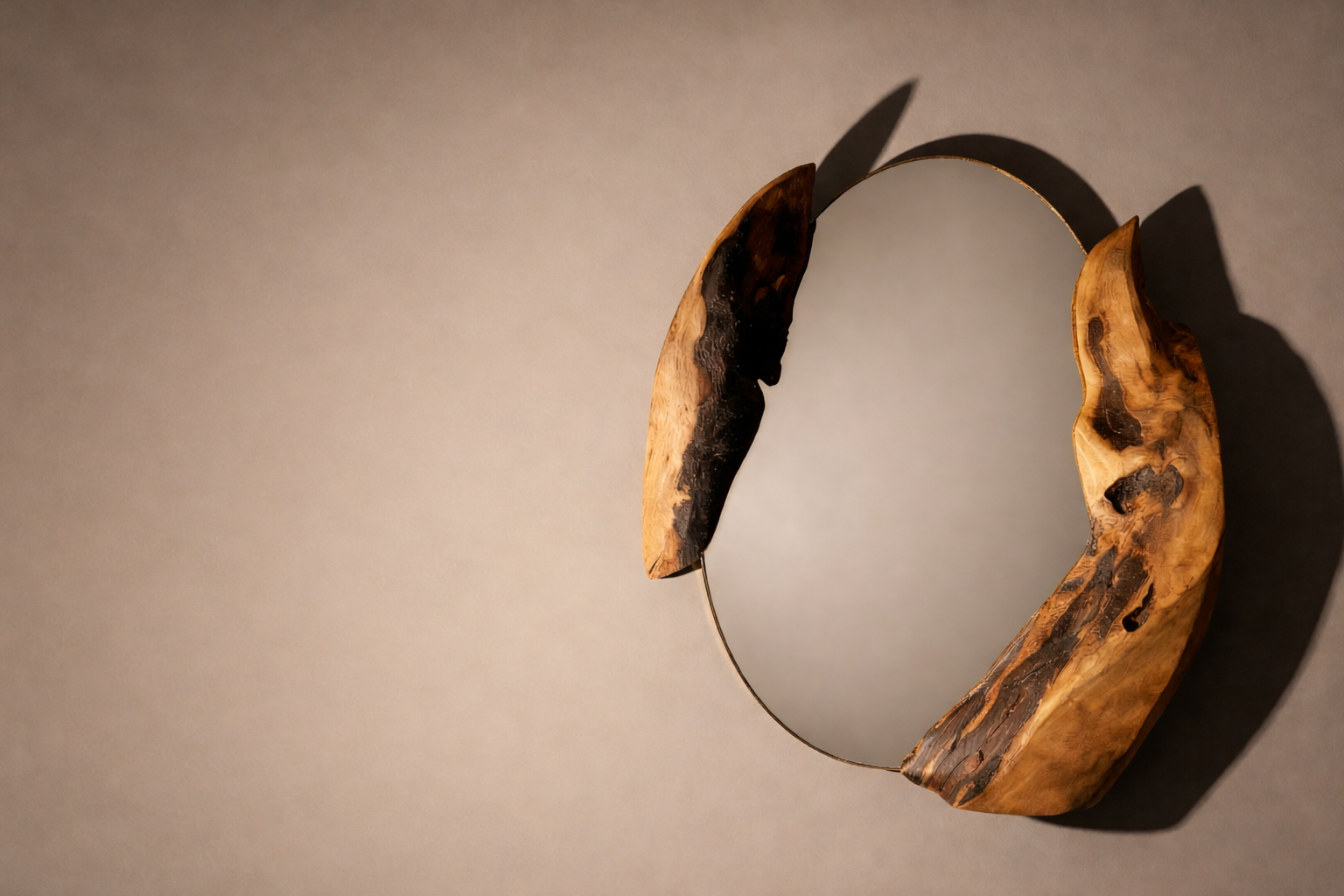 Kézzel faragott tálak, tükrök, lámpák, amelyek a fa természetes szépségét ünneplik.