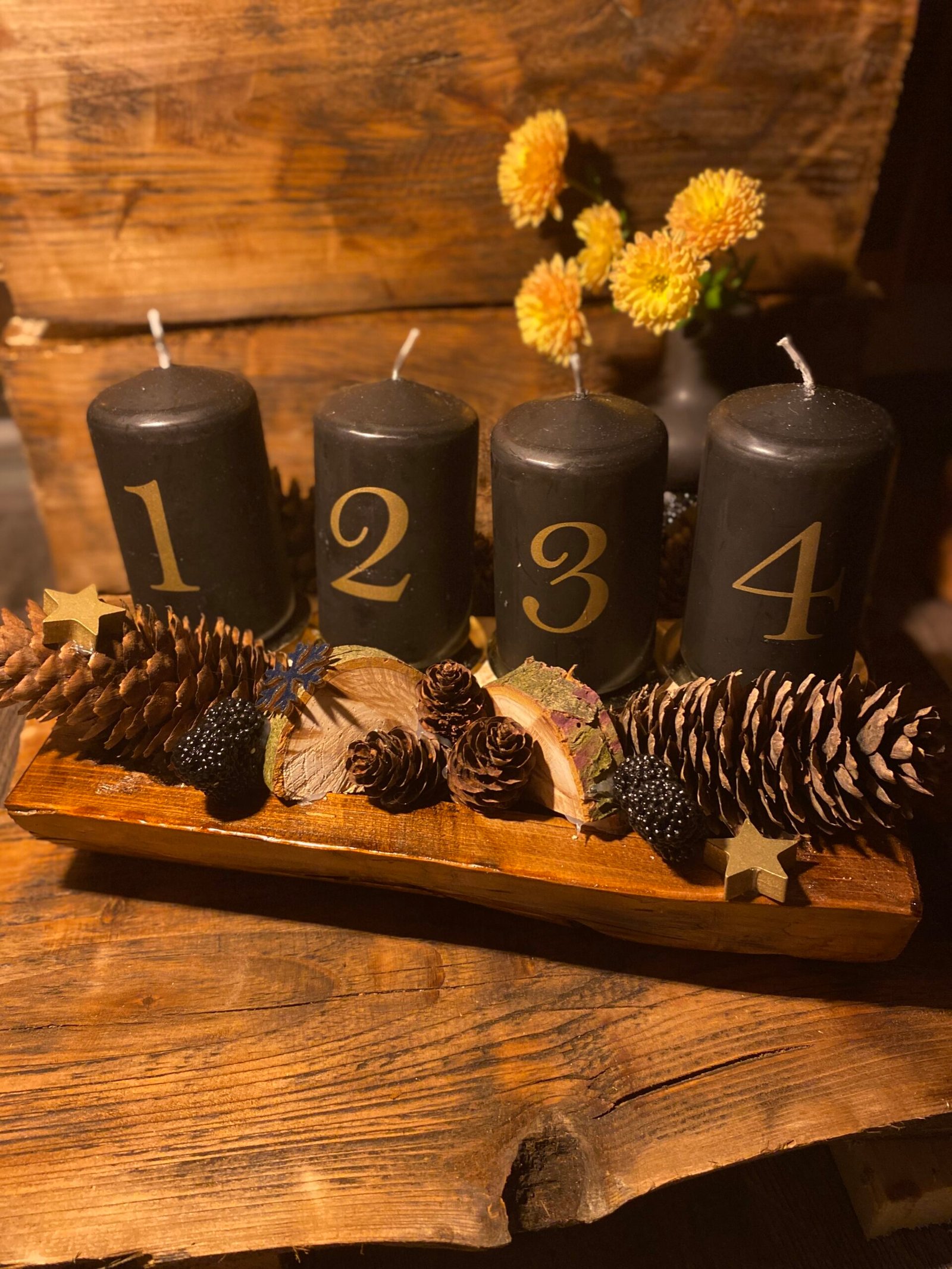 A kontraszt a sötét gyertyák és a természetes fa textúra között elegáns, skandináv hangulatot teremt, így ez a kézzel készült adventi dekoráció ideális választás azoknak, akik a modern, letisztult stílust ötvöznék a természetes anyagokkal.